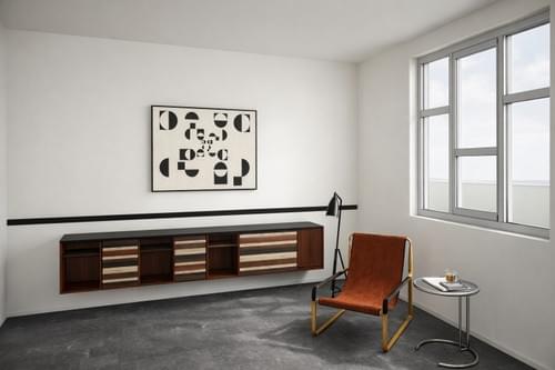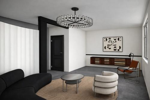 Une cloison courbe accompagne le canapé et redessine la perception du salon. Sa douceur dialogue avec la structure du lieu et en adoucit la géométrie. Surface d’intervention — 45 m²