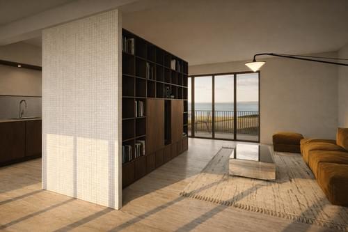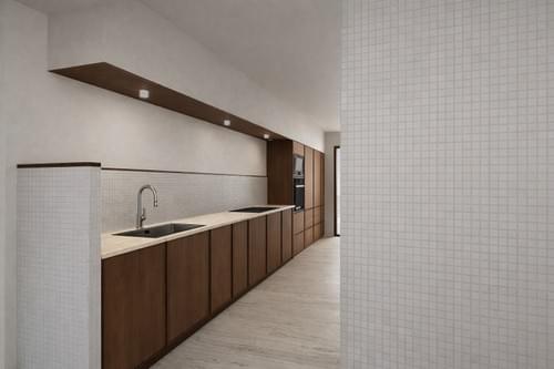 Le volume central organise les pièces et s’épaissit pour accueillir les usages. La paroi carrelée devient un seuil habité, à la fois présence et ouverture. Surface d’intervention — 65 m²