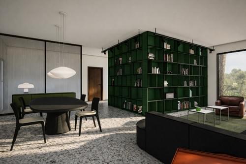 Une bibliothèque sur mesure devient l’élément central qui organise un espace en L. Elle sépare les usages sans cloisonner et clarifie les circulations entre coin repas et salon. Surface d’intervention — 45 m²